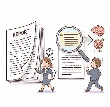 そして、伝えたい「結論」を最初に明確にしよう。「月曜日の遅刻者が他の曜日の2倍多い。原因は週末の夜更かし。対策として、日曜夜の就寝時間を早める啓発活動を提案する」——こんな風に、3〜5行で要点をまとめる。これが「エグゼクティブサマリー」。忙しい人はここしか読まないから、一番重要な部分だ。