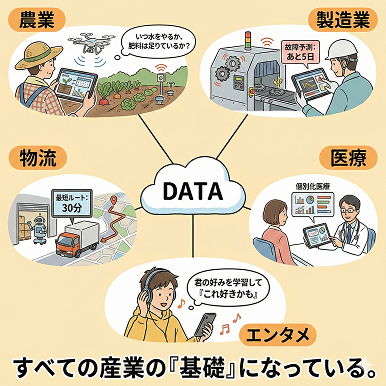 総務省の調査(2023年「情報通信白書」)によると、世界中で1日に生成されるデータ量は約2.5エクサバイト(25億GB)。これは映画の約10億本分に相当する量だ。企業も、学校も、病院も、役所も、みんなデータを使って動いている。商品を開発するとき、治療方法を選ぶとき、街づくりの計画を立てるとき、あらゆる場面で、データが「判断の材料」になっている。